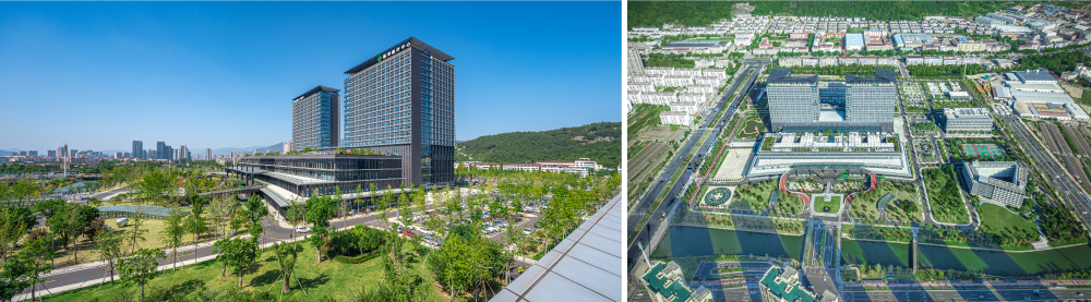 台州病院新院区は1200 床を有し、外来および医技機能を一体化したハイエンドの三次甲等総合病院です。「森の中の病院」という理念のもと、植栽に囲まれた癒しの環境を創出しています。景観に加え、プラットフォームやサンクン広場など建築周辺にも豊かな緑化を施し、患者および医療従事者に良好な緑あふれる憩いの空間を提供し、名実ともに「森の中の病院」となっています。