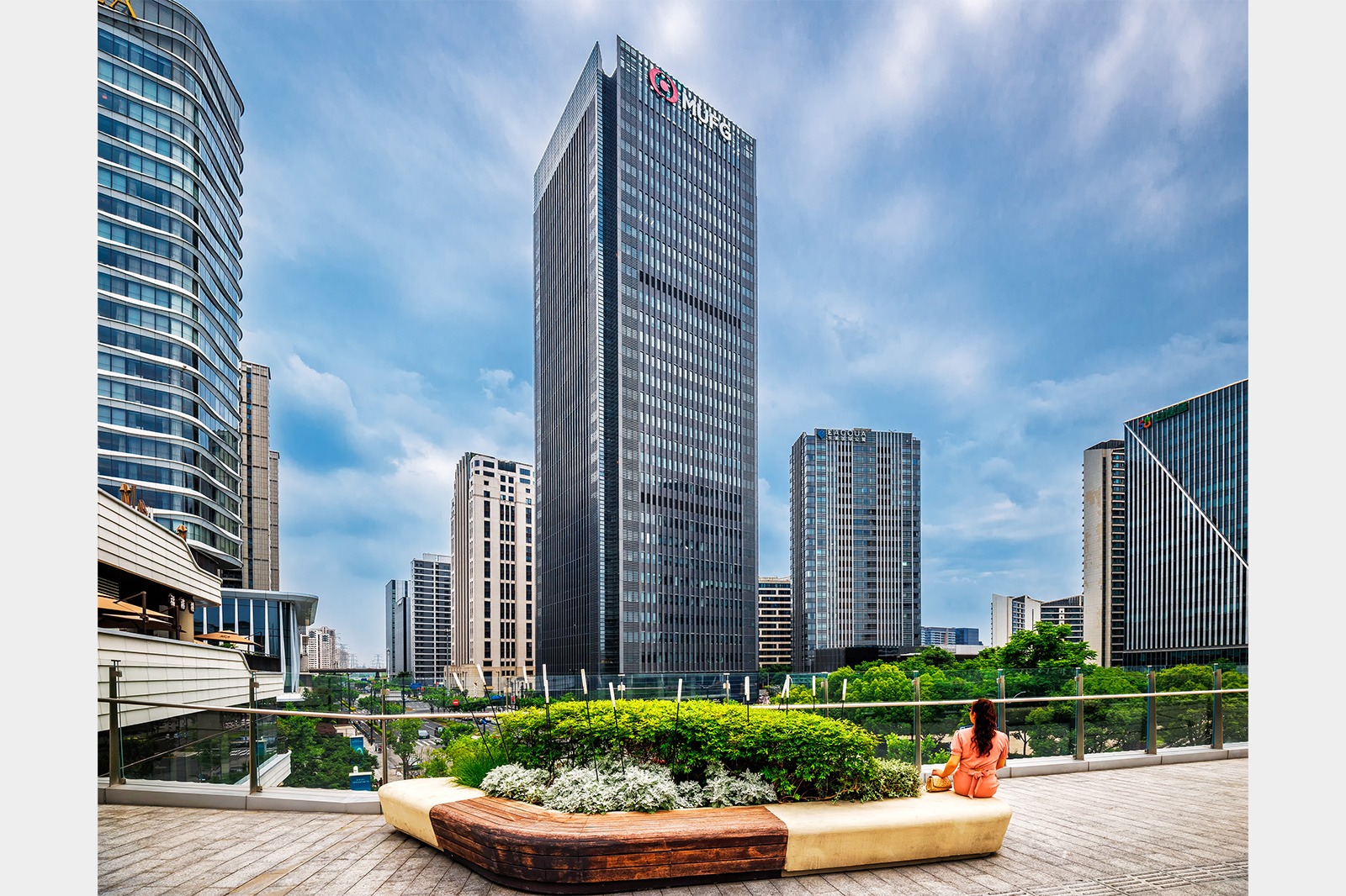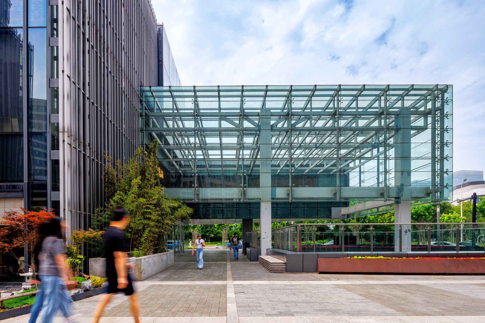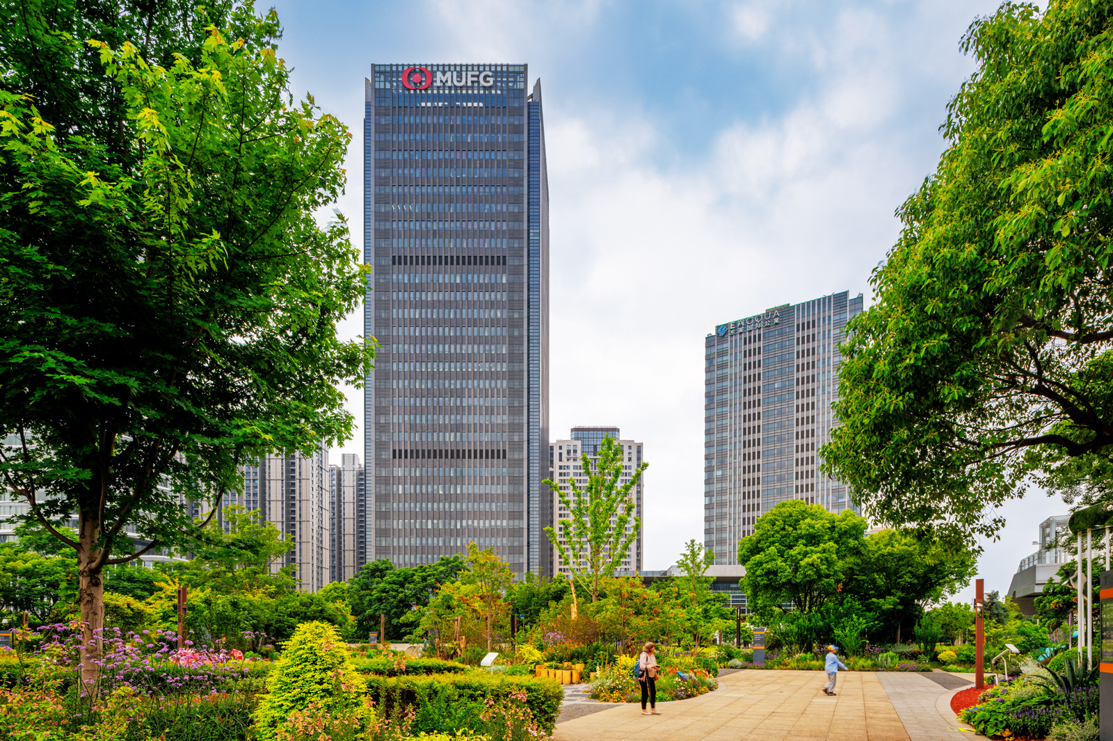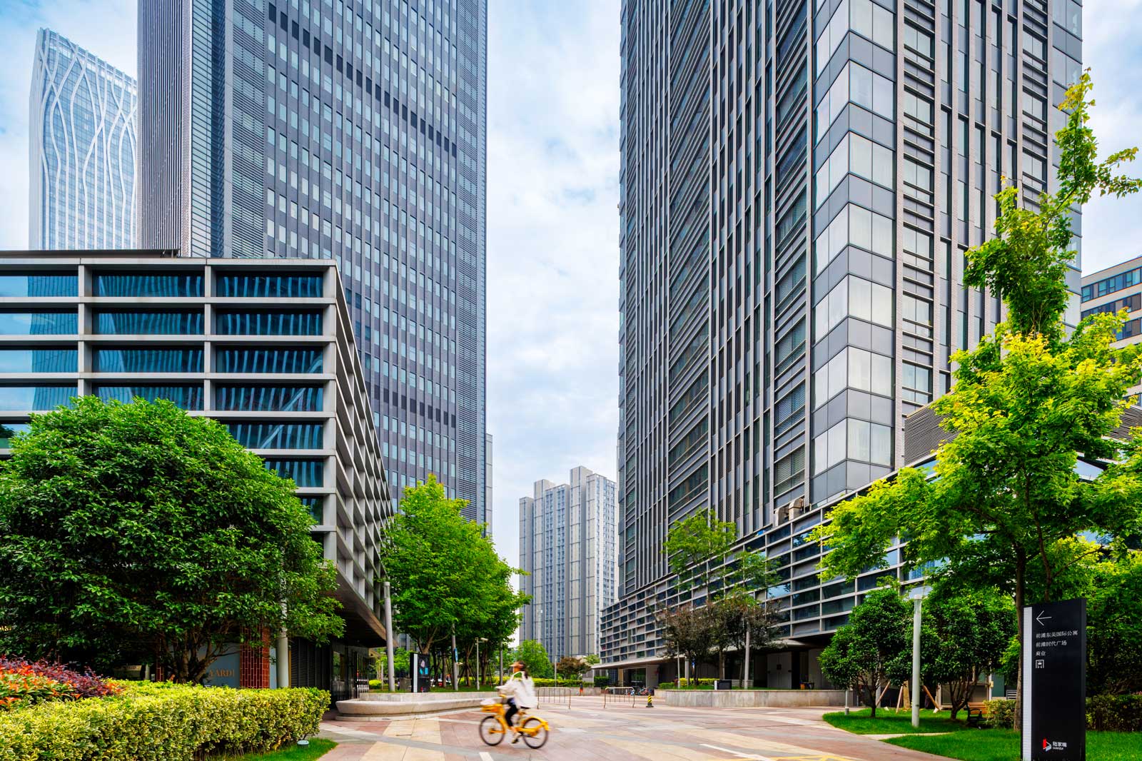 職住近接の街づくりが進む上海市浦東・前灘エリアに位置する複合施設です。オフィス、サービスアパート、商業の各機能が敷地を囲むように配置され、中央には隣接する都市公園と連続するオープンな広場を設けました。