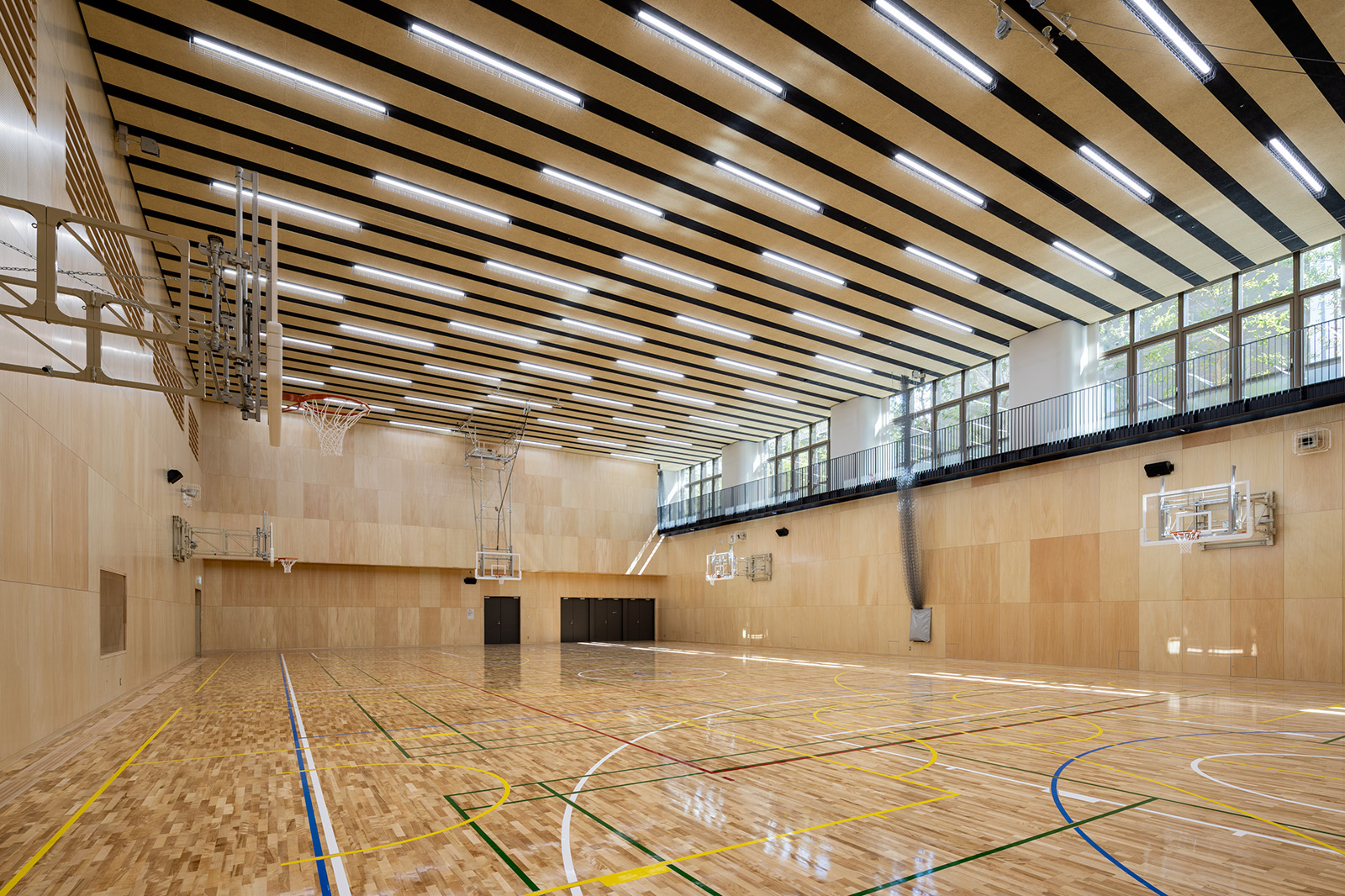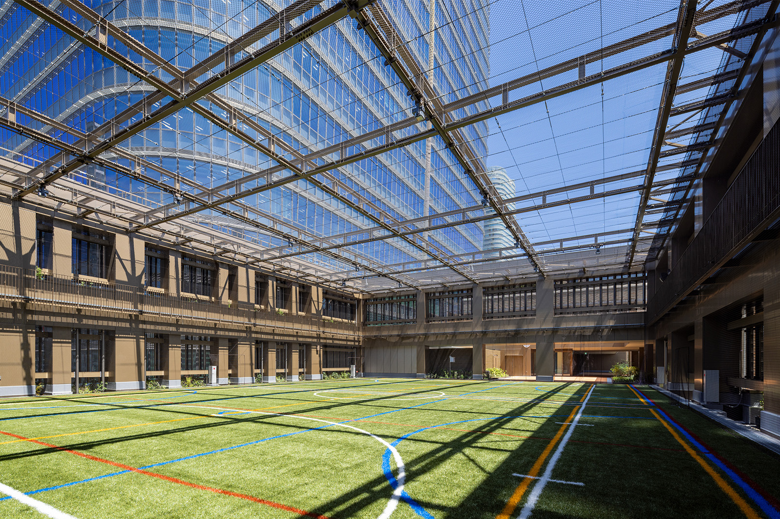 主な階構成は、地下1階に体育館・講堂・屋内プール、1階にエントランスロビー、2階から6階にかけて普通教室・特別教室を配置し、1階と5階には人工芝の校庭を設けています。