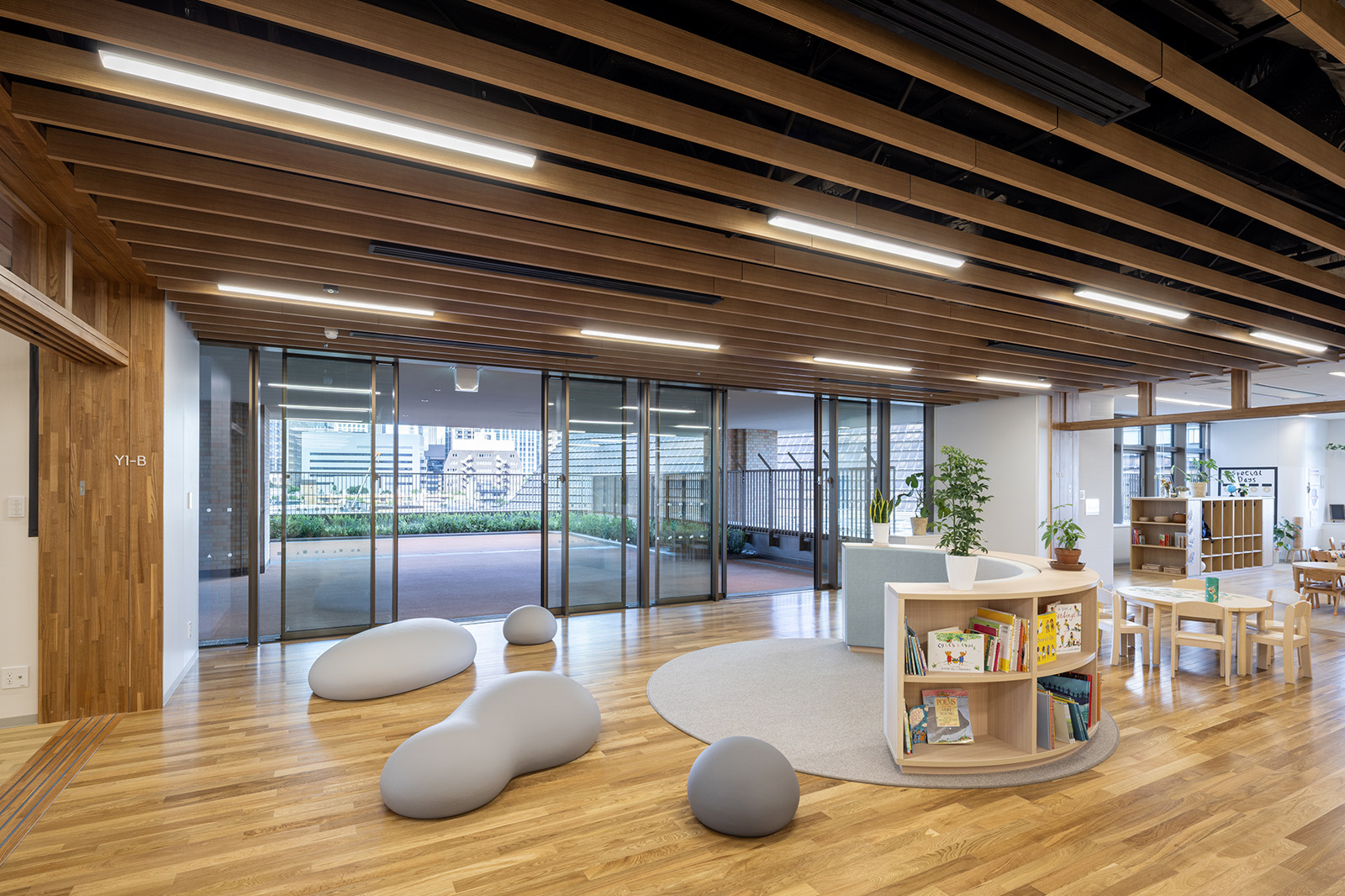教室フロアの南北には普通教室に囲まれる形で各学年専用のオープンスペースである「共用エリア」を設け、シーンによって共用エリアに面した木製連続引戸を引込むことで、教室と共用エリアを一体的に利用でき、多様な学習活動が行える設計としています。