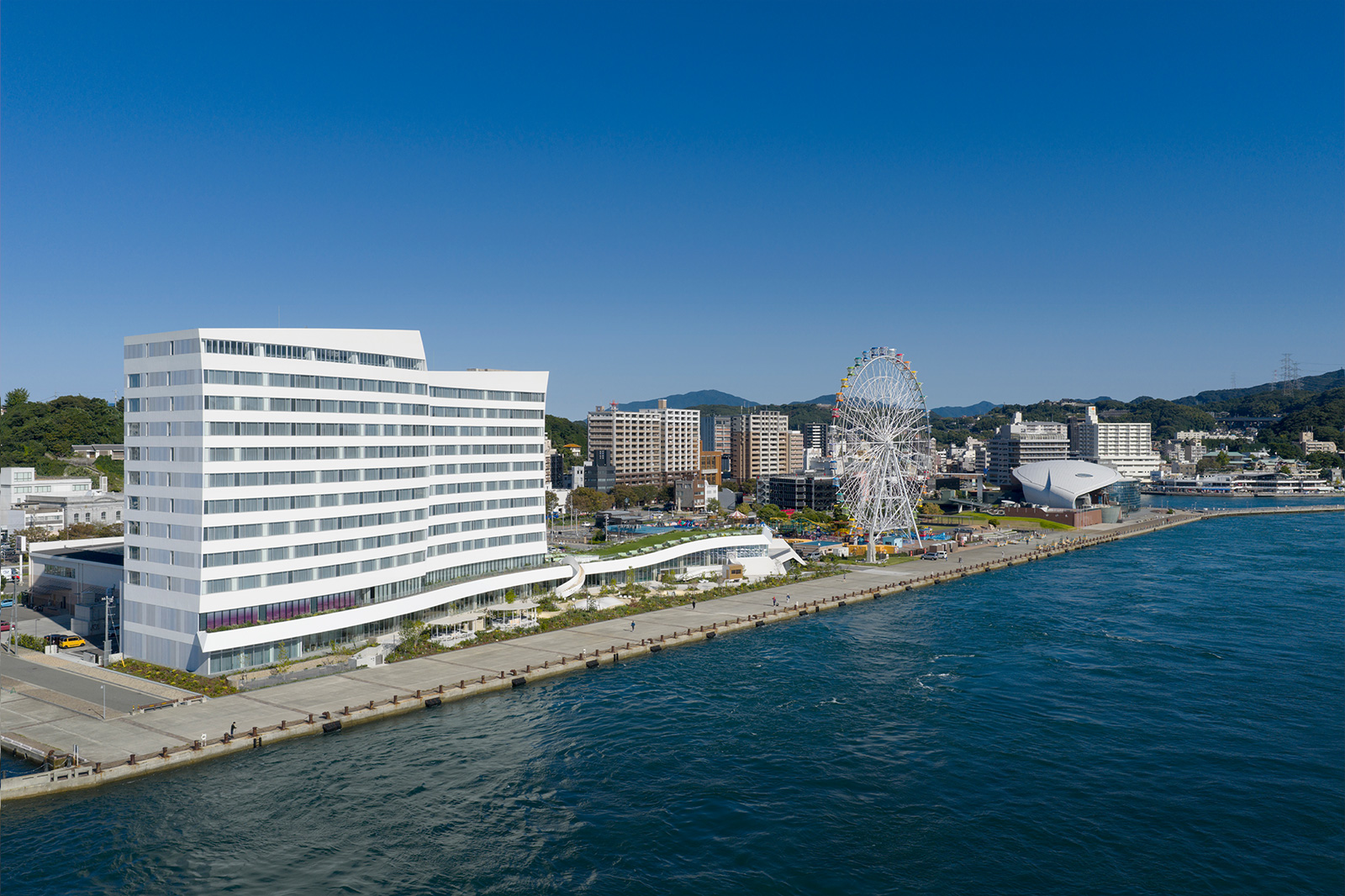 建築は潮流を思わせる曲線を随所に取り入れ、円弧を反転させた客室棟や帆のようにふくらむ断面形状、約250mの大屋根によって海と一体となる景観を創出。外装は光と空の色を受け止める白い左官仕上げとし、環境に溶け込む佇まいを目指しました。