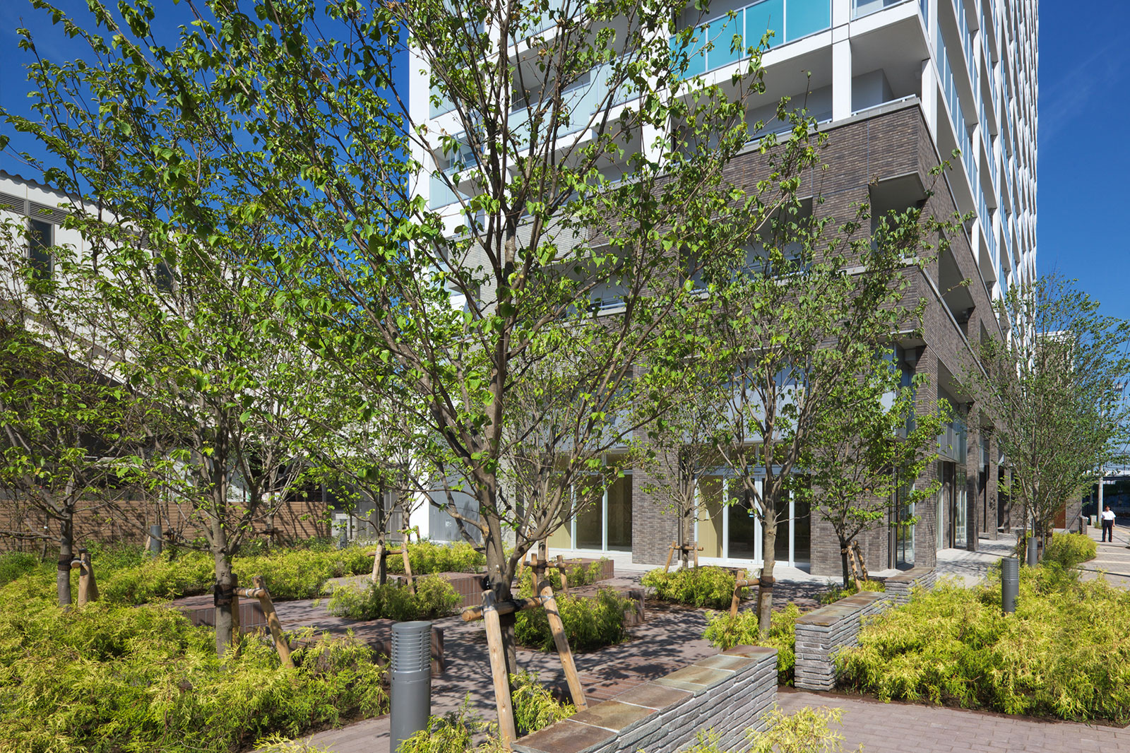 店舗が面する緑化された公開広場