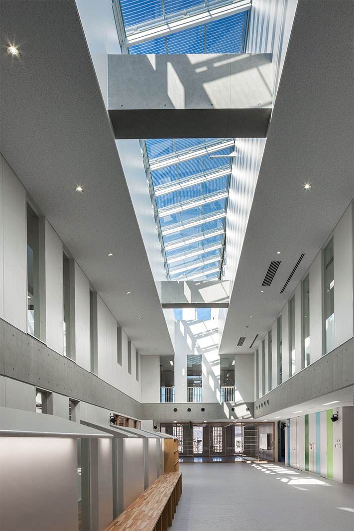 既存中学校を全面改修し新築部分と接続して利用した、施設一体型小中一貫校です。
