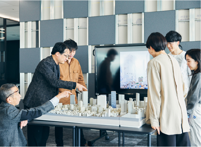 社会やまちの課題に向き合いながら、建築や都市の未来を構想から実現まで形にする仕事です。多様な専門領域が集まり、互いの知見や経験を生かして協働しています。