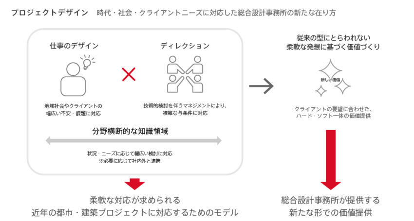プロジェクトデザインとは、建築の在り方が多様化・複雑化・長期化する時代において、地域社会やクライアントの課題に対し、対話を通じてデザインし、時流に柔軟に応じながらディレクションしていく、新たなプロジェクトの進め方です。