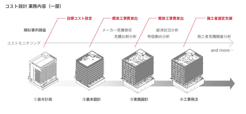 コスト設計は、建物におけるコストマネジメントを専門とする領域です。クライアントや設計者が目指す建物を実現するため、コストを管理し、設計者をサポートします。限られた予算の中で建物の最大価値を引き出すことが私たちの使命です。