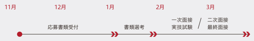 書類選考、1次面接、2次面接、実技試験(小論文含む)、適性検査、最終面接