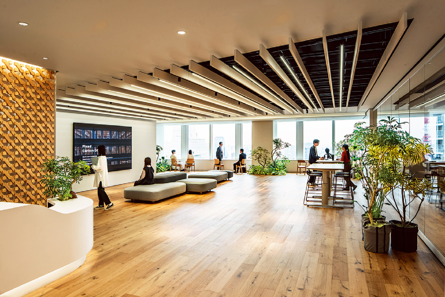 東京タワーが目の前に迫る眺望が広がり、東京都心の変わりゆく風景を体感できます。企業風土を表す白を基調とし、未来の共創を想起させるとともに、フローリングを主体とした親しみやすい空間により議論の活性化を図ります。受付壁面はロゴを模した木のピースを組み合わせ、個性ある社員の集合で作り上げられたチームとしての日本設計を表しています。