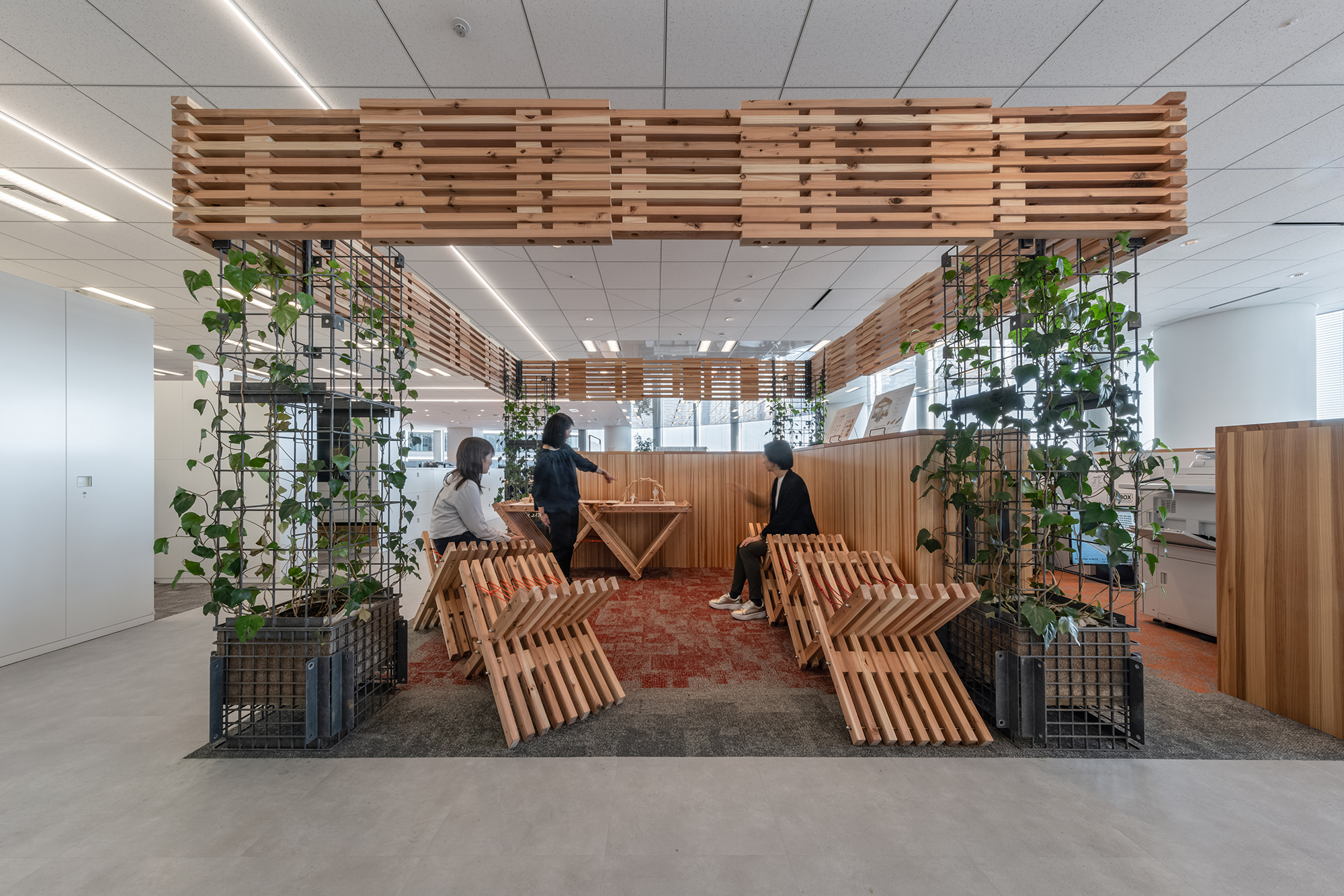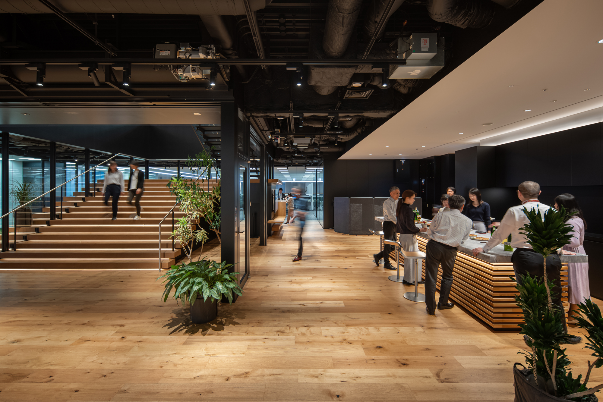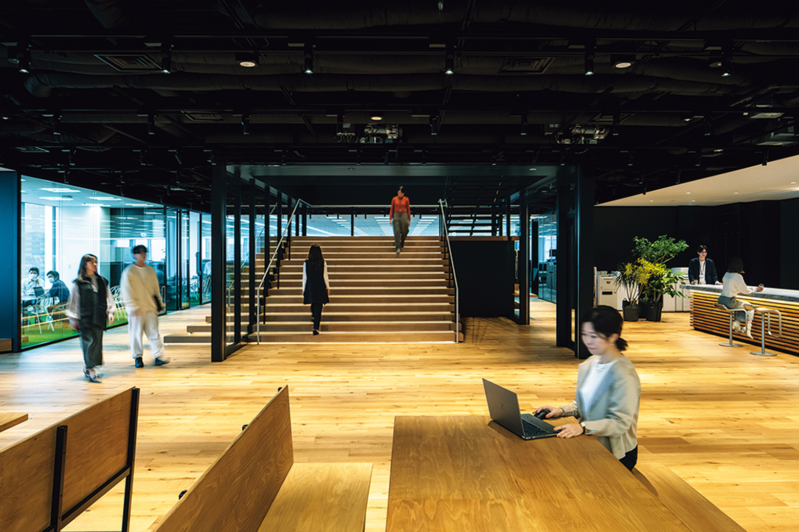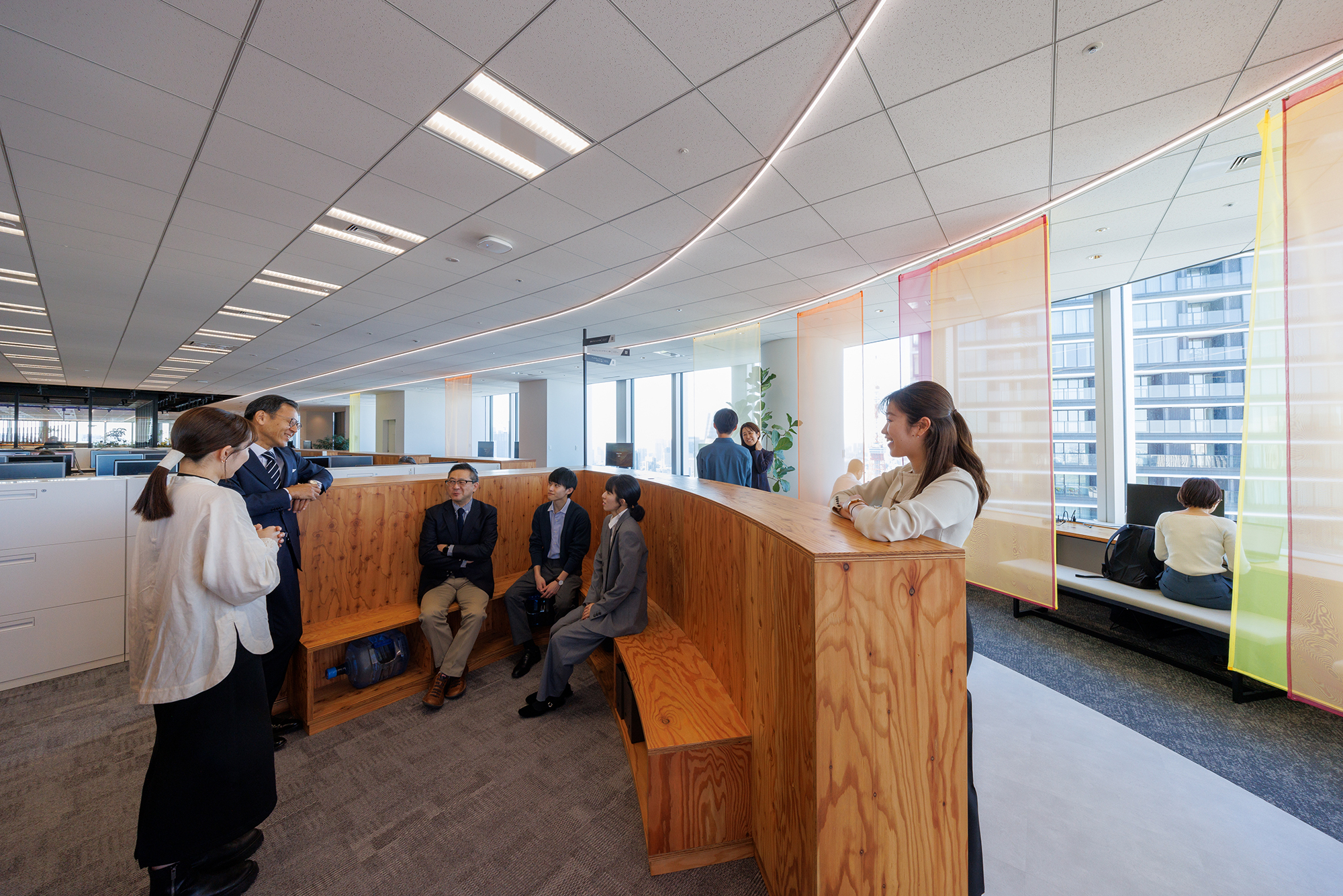 都市の中の屋外階段広場のような、交流の中心であり、人が集まる場所。イベント時は総合受付と一体的に利用します。日本設計が大切にする思想「領域を横断しながらつなぐ」を表現しています。社内外の接点となる場所として一体感を作りながら、全社的な交流の場にもなる、フレキシブルな広場空間です。