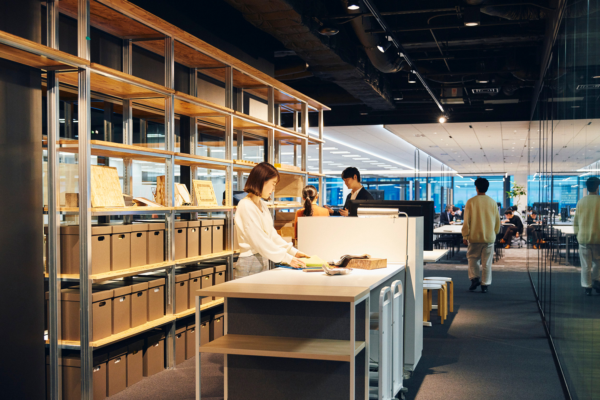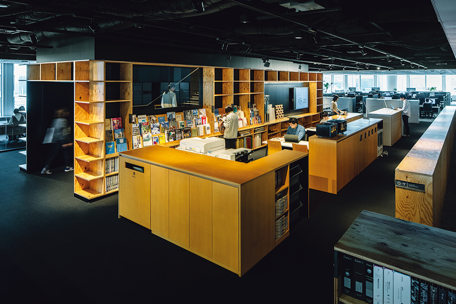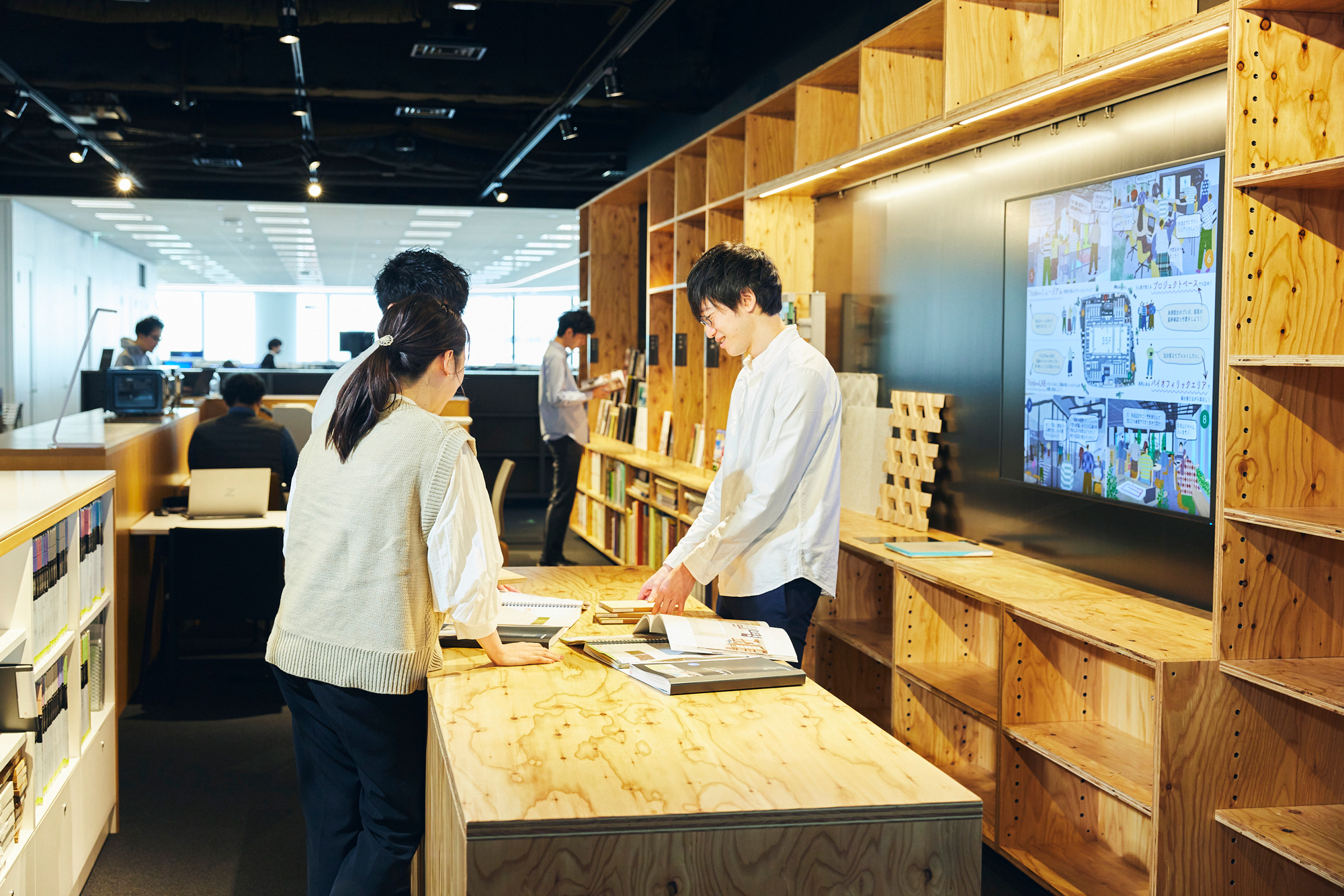 複数部門で共有し、部門の情報発信やモノの拠点となる場。各部門が持つ資料や模型の展示、デジタルサイネージによる発信などにより部門間のコミュニケーションを誘発します。