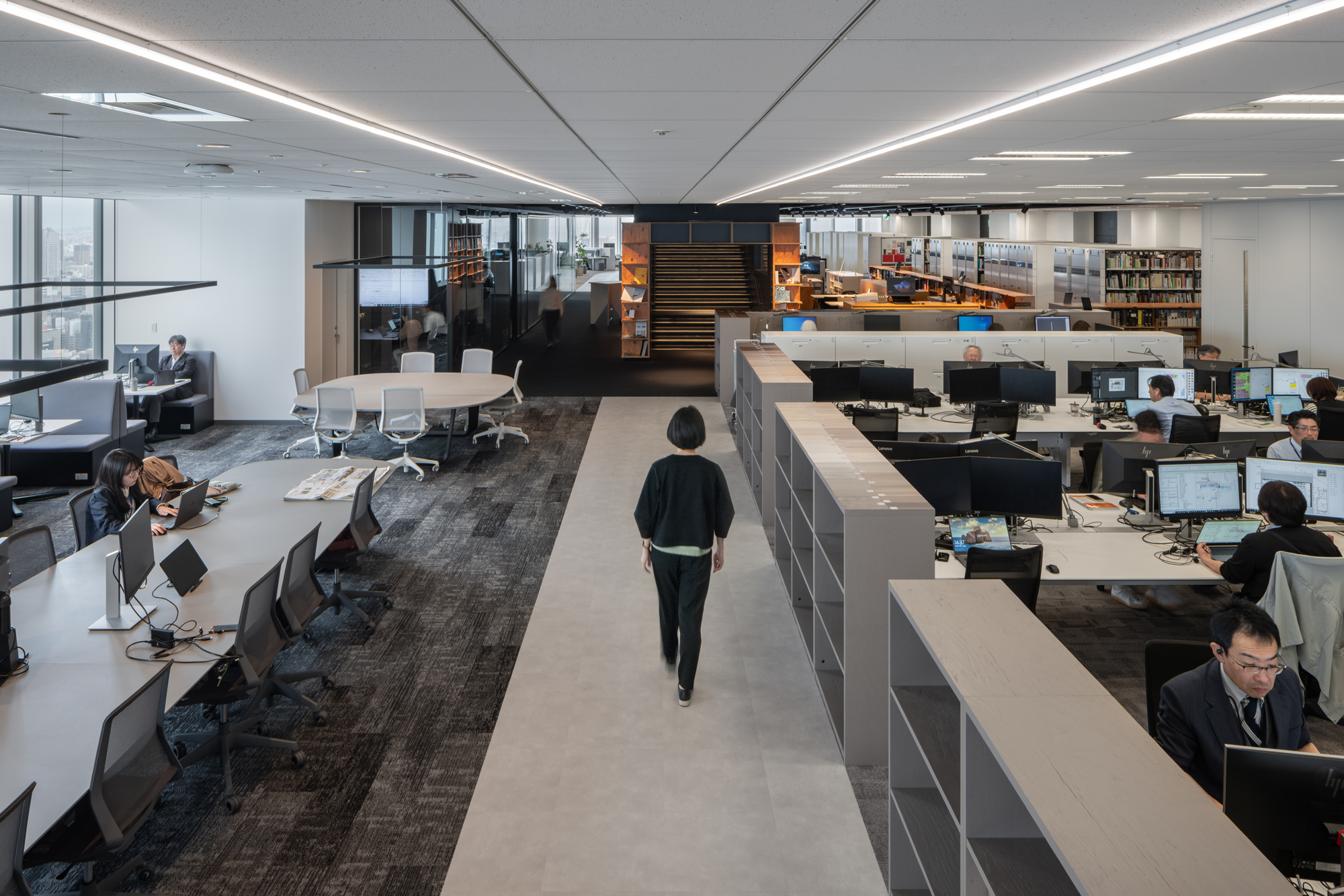 アーカイブ資料が集約・可視化された空間。知のシンボルとしての棚に書籍が集約され、やや暗めで静かな落ち着いた空間で読書や情報収集に集中できます。北階段は35階の活発な雰囲気から、知に没頭できる静かな空間へと切り変えるアプローチの役目も果たしています。