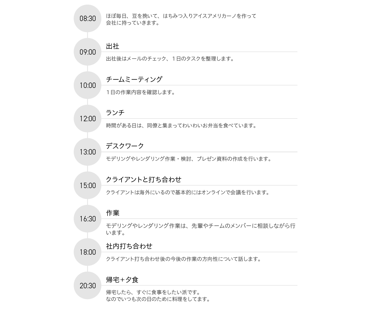 設計業務ではPCに向かって長時間座ることが多いため、日常生活では意識的に体を動かすようにしています。週に一度ヨガに通い、仕事終わりにはアプリを活用して自宅でピラティスを行うのが日課になっており、心身をリフレッシュしています。また、健康的な食生活も大切にしており、昼食はお弁当を持参して同僚と一緒に食べながら会話を楽しんでいます。業務後は同僚や友人と食事に出かけることも多く、良い気分転換になっています。オフィスのある虎ノ門・新橋エリアには美味しいレストランが数多くあり、どのお店に行こうかと考えること自体が日常の楽しみの一つになっています。