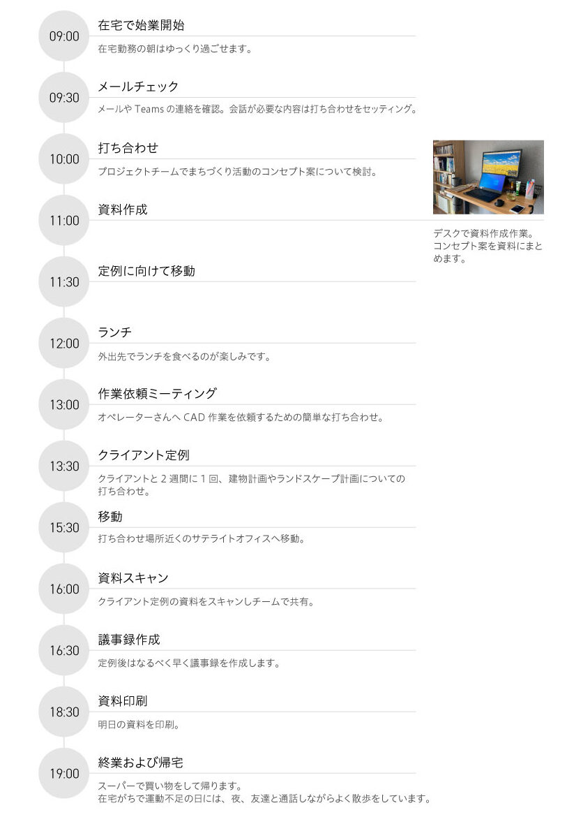 作業時間や家庭での時間を確保できるように、在宅勤務やサテライトオフィスをうまく活用しながら移動時間を減らし、効率よく業務が行えるように意識しています。また、業務量が逼迫してきた時は、締め切りを長めに設定してもらったり、どこまで作業すれば支障がないかをチームで確認し、自分の時間を守ることも意識するようになりました。単純なことですが、コロナ禍で入社しさまざまな働き方をしている人がいる中で、少しづつ自分の働き方を確立しています。
