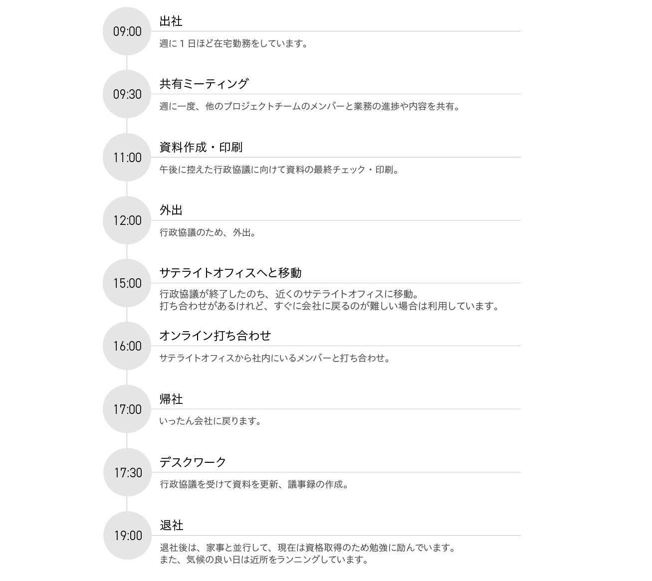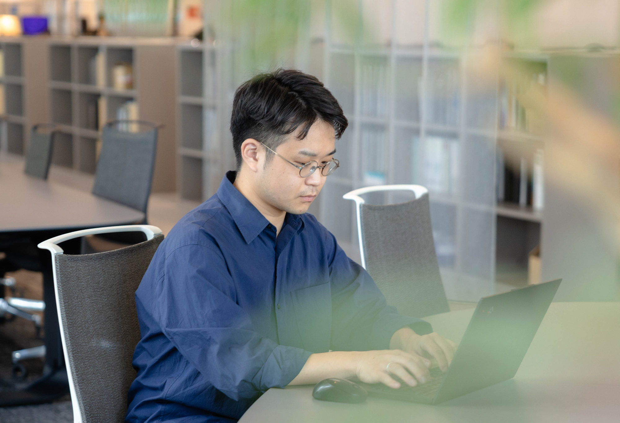 とてもフラットな雰囲気の職場だと感じています。業務の中で行き詰ったことや疑問点があれば、担当プロジェクトの垣根を越えて質問できる環境があり、風通しの良さを実感しています。また、座席はフリーアドレスのため、複数人で話し合いながら作業を進めることもあれば、一人で集中して取り組むこともでき、状況に応じてさまざまな働き方が選べる環境です。