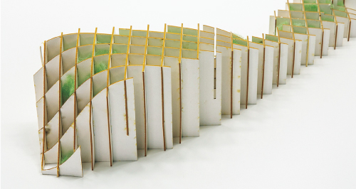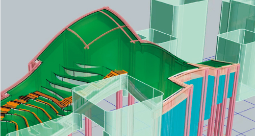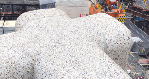 「ネットフレーム」の実現には、具体の素材選定、構造・工法の検討に長い時間をかけ、東京とロンドンでのワークショップを繰り返し、ヘザウィック・スタジオと一体となって検討を重ねました。素材については金属パネル、GRC(ガラス繊維補強セメント)、左官系塗材などの案のなかで、私たちは、うねる3次元曲面を可能にし、かつ凹凸や質感のある「GRC洗出し仕上げ」を提案。メーカーと共同して試作しながら、GRCパネルの強度や長期的な耐久性、微妙な色調、種石の大きさなど、細部にまでわたる多くの検討と実験を重ね、多種多様な形状のGRCパネルによるネットフレームのデザインを高いクオリティで実現させました。
