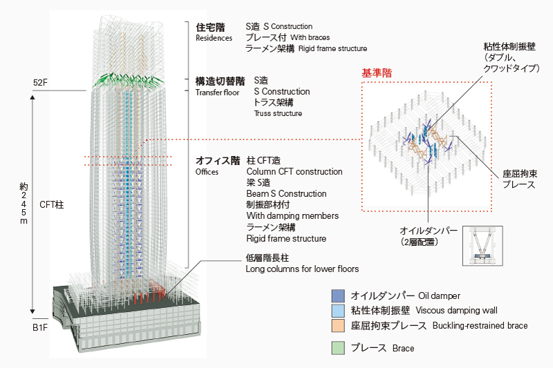 タワーの構造は、柱CFT造、梁S造のブレース付きラーメン架構で、コアに配置した3種類の制振部材により地震や風のエネルギーを吸収する制振構造です。2種類の粘性系制振部材を地震時の変形が大きな下層階のコア部に集中的に配置することで、地震時の揺れを効率的に低減しています。