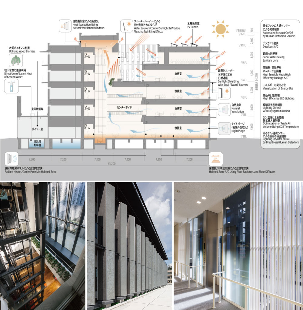 上:雲南市型環境建築の全体像/左下:ウォータールーバー/中央下:鋼製剣ルーバー/右下:輻射冷暖房