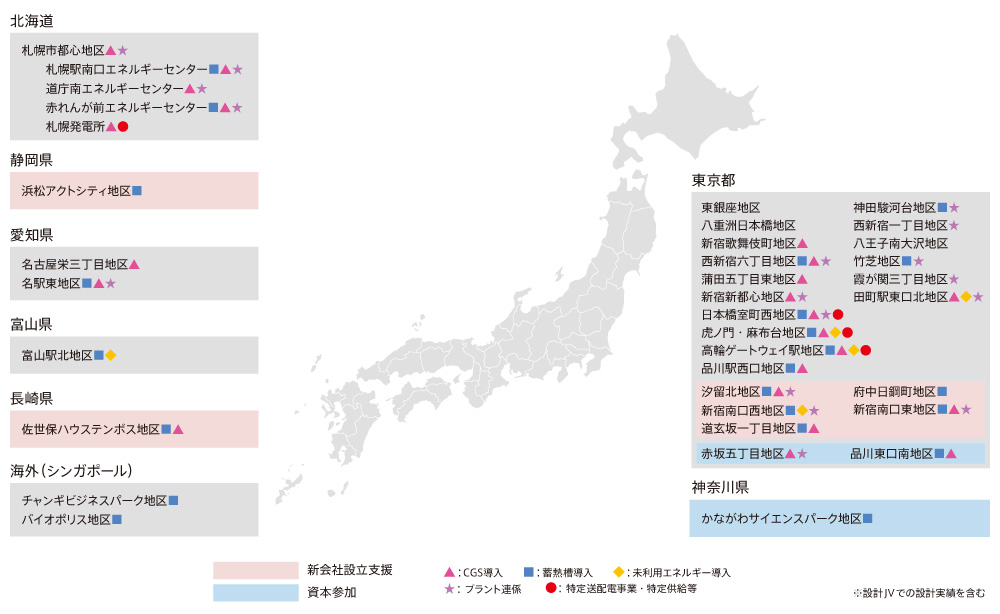 日本設計では、熱供給事業に関わる調査・企画・検討から、地域冷暖房プラント・地域導管の設計・監理に至るまで、豊富な経験と実績を活かして幅広い業務を行っています。今まで熱供給事業の新会社設立支援、海外、特定送配電事業なども含め、約30地区の地域冷暖房に携わってきています。コージェネレーションシステム(CGS)や蓄熱槽の積極的な導入と共に、プラント間で連携したエネルギーの面的利用の実績も多いことが特徴です。